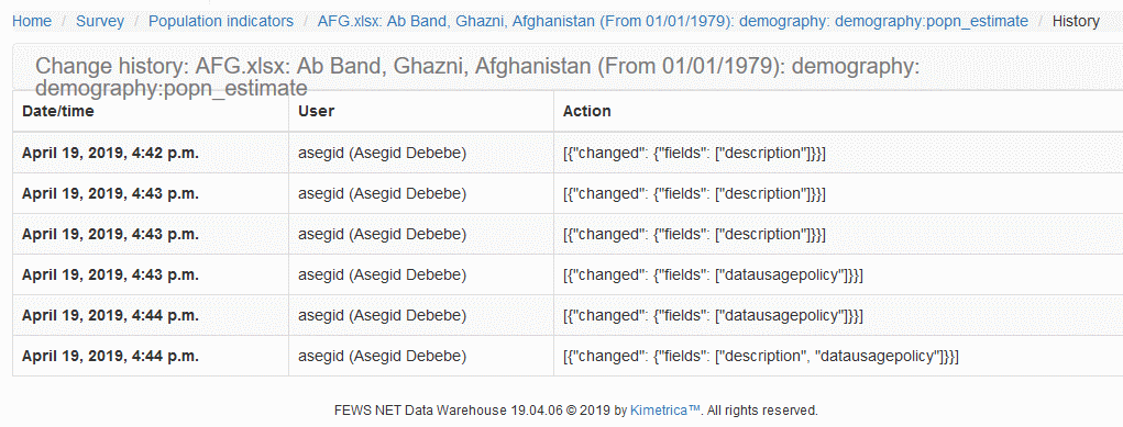 button at the top-right side of the page.Then the system displays the Change history page where you can see the details of the updates and other operations carried out against the selected Population Indicator Value record (see below)