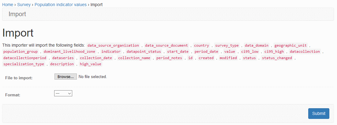 Users can upload/import a bulk file containing data_source_organization, data_source_document, country, survey_type, data_domain, geographic_unit, population_group, dominant_livelihood_zone, indicator, datapoint_status, start_date, period_date, value, ci95_low, ci95_high, datacollection, datacollectionperiod, dataseries, collection_date, collection_name, period_notes, id, created, modified, status, status_changed, specialization_type, description, high_value into the system using the Import functionality in the system.