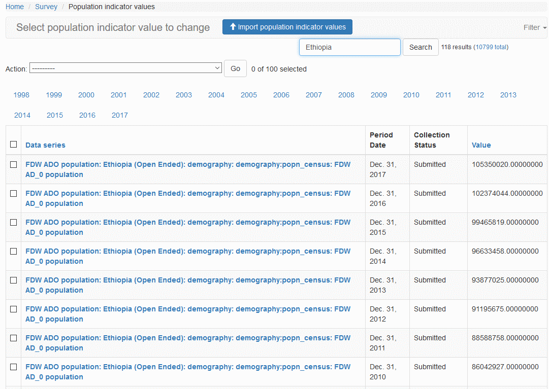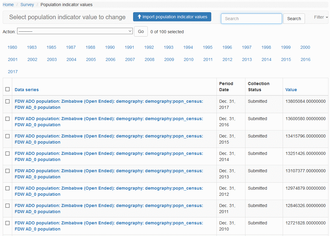 The Population Indicator Values page can be opened from KDW menu: Dataseries Management > Data Points > Population Indicators Value