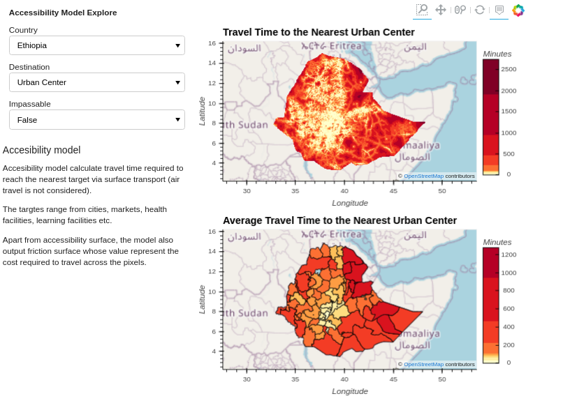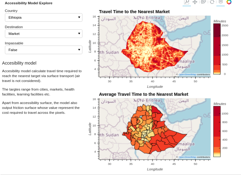 The accessibility model outputs travel time to the nearest town in GeoTIFF and GeoJSON format.